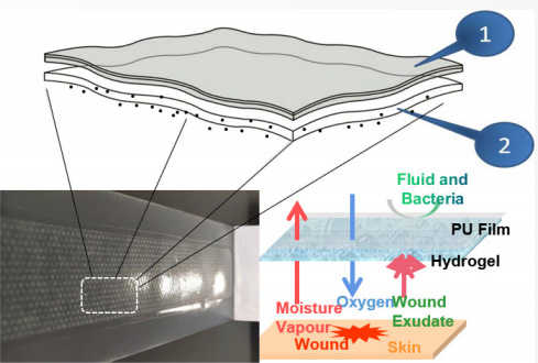 復合化智能型高端醫(yī)用水凝膠敷料,采用紫外光交聯(lián)水凝膠合成技術(shù),1 分鐘內(nèi)讓水凝膠熟成,形成三維立體網(wǎng)絡(luò)親水性高分子 ; 制程避免溶劑揮發(fā)及過量能源消耗等環(huán)境污染問題。